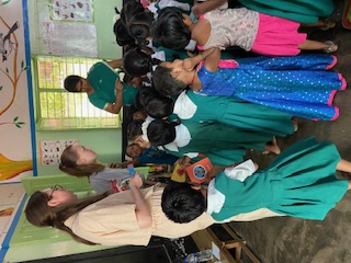 When assembly ended we couldn’t wait to start playing kabaddi, which was like a mixture of rugby and tag with no balls involved, our main goal was to touch as many people on the other side and come back to your own half, without being taken out or pushed out. Doron, Dylan and I played aggressively and at the start Dylan’s shirt was ripped open, with buttons now missing. As the children realised I was the best Doron and Dylan went on the same team and I was ganged up on. Some girls from our group joined the game and Tilly and Freya were tagged by Doron in a flash. The children called me cute and beautiful and decided to name me Jung Kook. They cheered me on while playing kabaddi by chanting BTS. I had a great time, however Doron and I were drenched in sweat and we had to eat dinner without a shower attracting all the mosquitos.