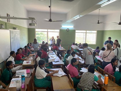 They said they would all be doing our hennas and they got to work. The woman doing mine made a beautiful design and even added a bride! However it must have been hard for her as I was laughing so much my hand was shaking due to Maddies design next to me which looked like she had dipped her fingers in henna. Doron also got baited out by one of the students who told everyone about his design which was the letter F in a heart. Mr Beesley even got a cute teddy bear on his hand. Then we went to the Menora House which is the headquarters for the Presentation Sisters. We had samosas, Halva and drinks whilst getting to chat to the Sisters about our time in India and the Varasanadu clinic.